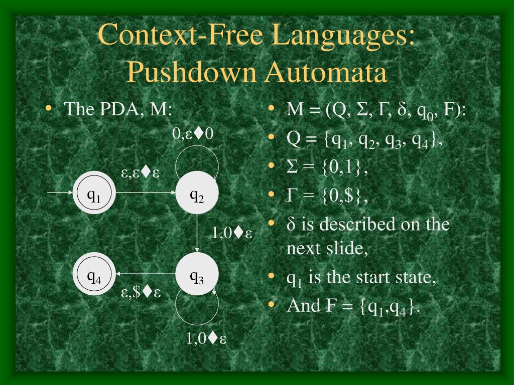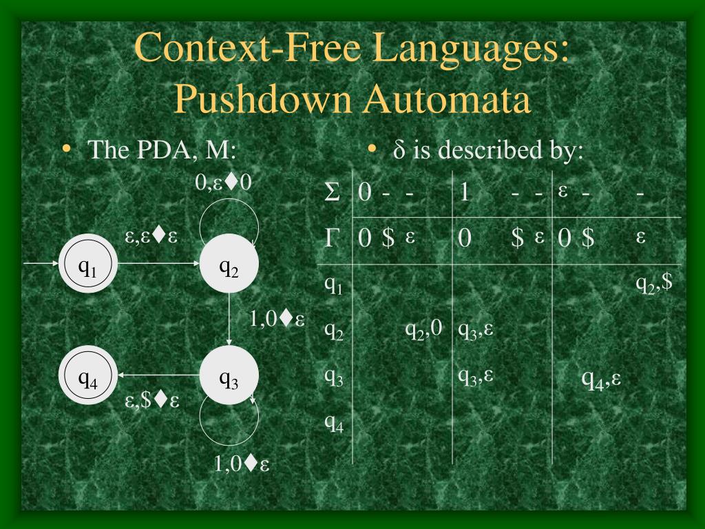 The PDA, M: M = (Q, Σ, Γ, δ, q0, F): Q = {q1, q2, q3, q4}, Σ = {0,1}, Γ = {0,$}, δ is described on the next slide, q1 is the start state, And F = {q1,q4}. Context-Free Languages: Pushdown Automata 0,ε0 ε,εε q1 q2 1,0ε q4 q3 ε,$ε 1,0ε