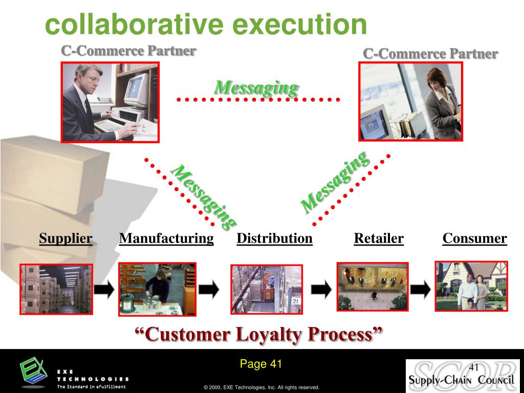 C-Commerce Partner Supplier Manufacturing Distribution Retailer Consumer collaborative execution C-Commerce Partner Messaging Messaging Messaging “Customer Loyalty Process”