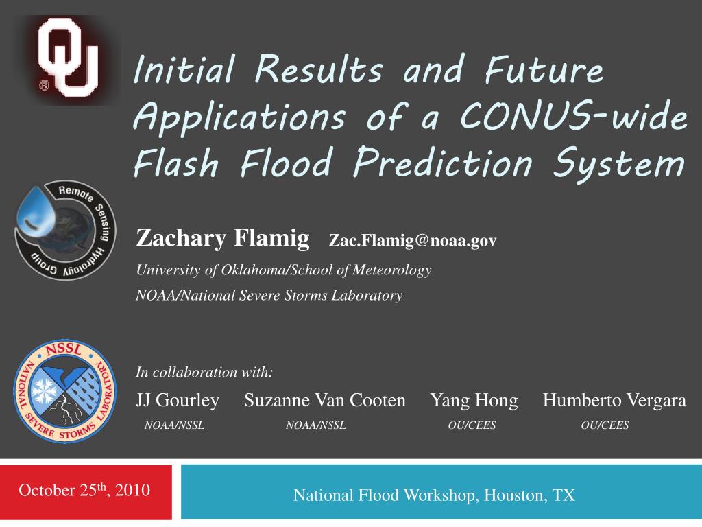 Initial Results and Future Applications of a CONUS-wide Flash Flood Prediction System Zachary Flamig Zac.Flamig@noaa.gov University of Oklahoma/School of Meteorology NOAA/National Severe Storms Laboratory In collaboration with: JJ Gourley Suzanne Van Cooten Yang Hong Humberto Vergara NOAA/NSSL NOAA/NSSL OU/CEES OU/CEES October 25th, 2010 National Flood Workshop, Houston, TX