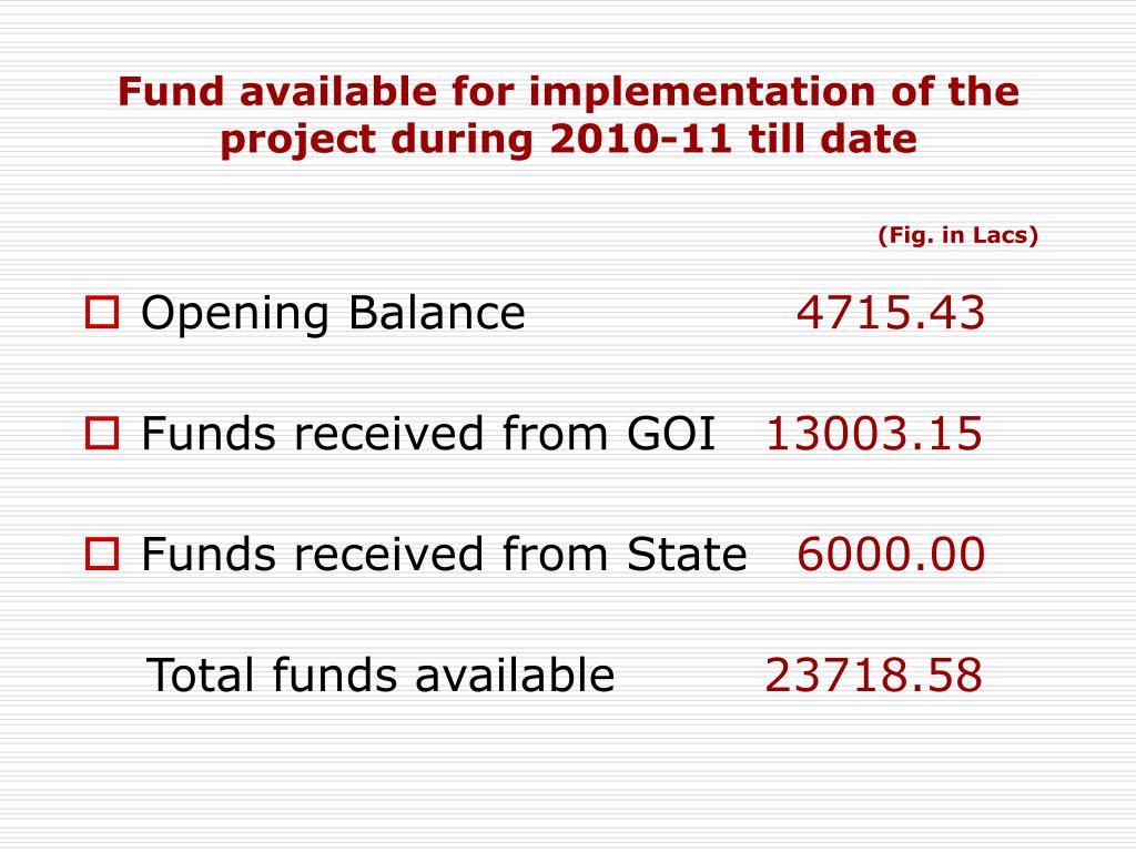 Fund available for implementation of the project during 2010-11 till date (Fig. in Lacs) Opening Balance 4715.43 Funds received from GOI 13003.15 Funds received from State 6000.00 Total funds available 23718.58