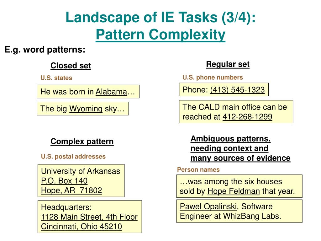 Landscape of IE Tasks (3/4):Pattern Complexity E.g. word patterns: Regular set Closed set U.S. phone numbers U.S. states Phone: (413) 545-1323 He was born in Alabama… The CALD main office can be reached at 412-268-1299 The big Wyoming sky… Ambiguous patterns,needing context andmany sources of evidence Complex pattern U.S. postal addresses Person names University of Arkansas P.O. Box 140 Hope, AR 71802 …was among the six houses sold by Hope Feldman that year. Pawel Opalinski, SoftwareEngineer at WhizBang Labs. Headquarters: 1128 Main Street, 4th Floor Cincinnati, Ohio 45210