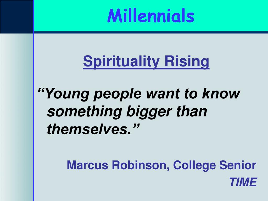 Millennials Spirituality Rising “Young people want to know something bigger than themselves.” Marcus Robinson, College Senior TIME