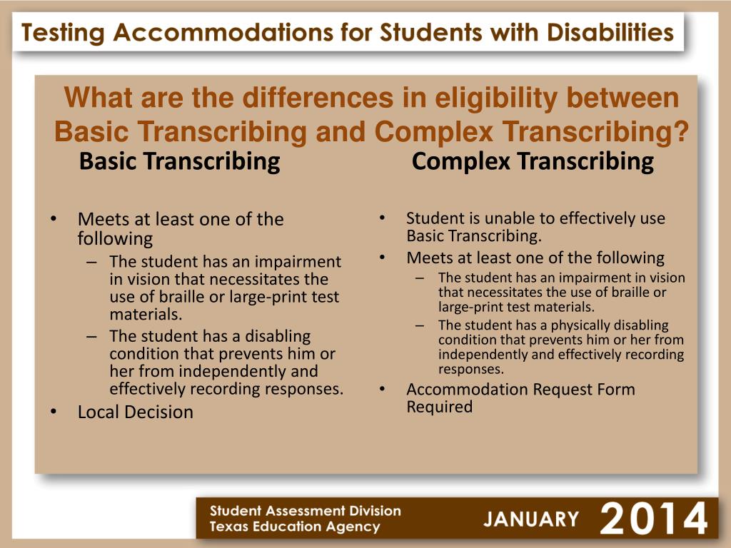 What are the differences in eligibility between Basic Transcribing and Complex Transcribing? Basic Transcribing Complex Transcribing • Meets at least one of the following • The student has an impairment in vision that necessitates the use of braille or large-print test materials. • The student has a disabling condition that prevents him or her from independently and effectively recording responses. • Local Decision • Student is unable to effectively use Basic Transcribing. • Meets at least one of the following • The student has an impairment in vision that necessitates the use of braille or large-print test materials. • The student has a physically disabling condition that prevents him or her from independently and effectively recording responses. • Accommodation Request Form Required