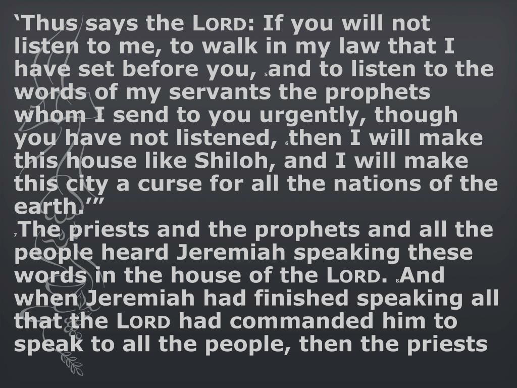 ‘Thus says the LORD: If you will not listen to me, to walk in my law that I have set before you, 5and to listen to the words of my servants the prophets whom I send to you urgently, though you have not listened, 6then I will make this house like Shiloh, and I will make this city a curse for all the nations of the earth.’” 7The priests and the prophets and all the people heard Jeremiah speaking these words in the house of the LORD. 8And when Jeremiah had finished speaking all that the LORD had commanded him to speak to all the people, then the priests