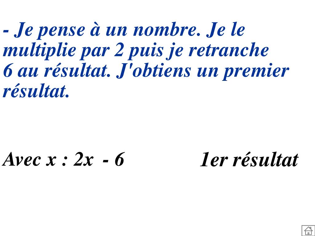 - Je pense à un nombre. Je le multiplie par 2 puis je retranche 6 au résultat. J'obtiens un premier résultat. Avec x : 2x - 6 1er résultat