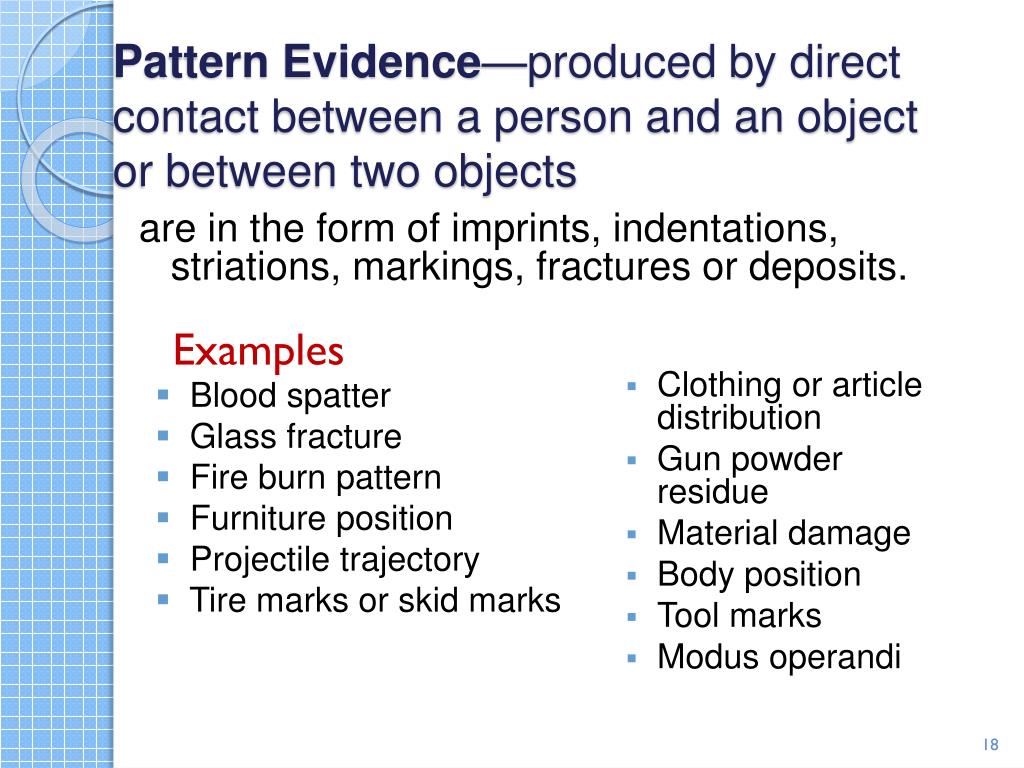 Pattern Evidence—produced by direct contact between a person and an object or between two objects are in the form of imprints, indentations, striations, markings, fractures or deposits. • Clothing or article distribution • Gun powder residue • Material damage • Body position • Tool marks • Modus operandi Examples • Blood spatter • Glass fracture • Fire burn pattern • Furniture position • Projectile trajectory • Tire marks or skid marks