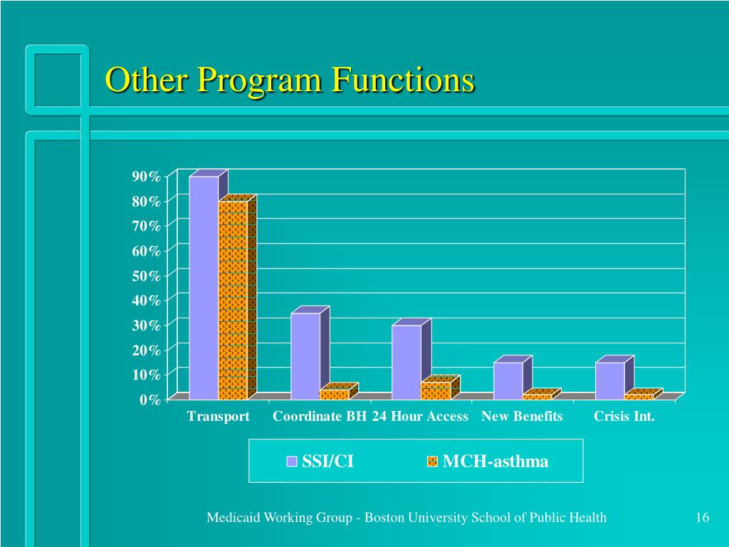 Detailed Program Descriptions • 51 plans • 18 states • 71 programs • 46 programs for MCH population, asthma or diabetes case management, hypertension • 20 programs for SSI population or some portion, special needs • 5 programs for COPD or cardiac disease mgmt. Medicaid Working Group - Boston University School of Public Health