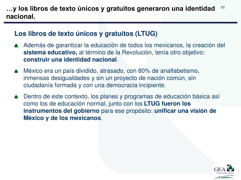 …y los libros de texto únicos y gratuitos generaron una identidad nacional. Los libros de texto únicos y gratuitos (LTUG) • Además de garantizar la educación de todos los mexicanos, la creación delsistema educativo, al término de la Revolución, tenía otro objetivo: construir una identidad nacional. • México era un país dividido, atrasado, con 80% de analfabetismo, inmensas desigualdades y sin un proyecto de nación común, sin ciudadanía formada y con una democracia incipiente. • Dentro de este contexto, los planes y programas de educación básica así como los de educación normal, junto con los LTUG fueron los instrumentos del gobierno para ese propósito: unificar una visión de México y de los mexicanos.
