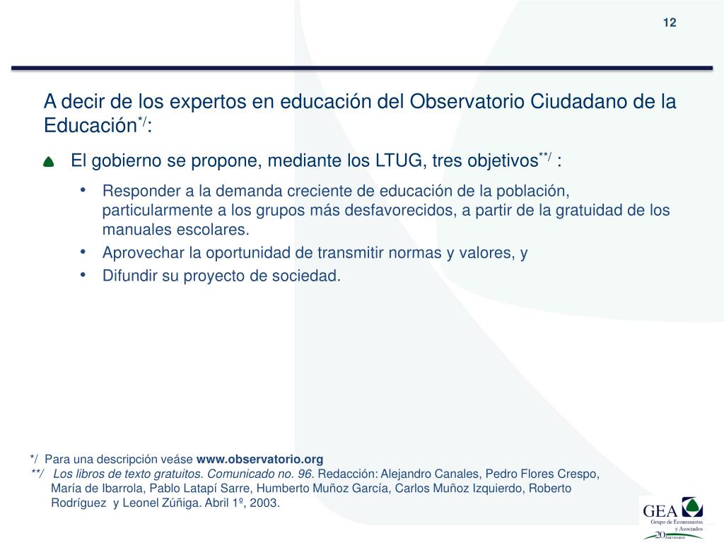 A decir de los expertos en educación del Observatorio Ciudadano de la Educación*/: • El gobierno se propone, mediante los LTUG, tres objetivos**/: • Responder a la demanda creciente de educación de la población, particularmente a los grupos más desfavorecidos, a partir de la gratuidad de los manuales escolares. • Aprovechar la oportunidad de transmitir normas y valores, y • Difundir su proyecto de sociedad. */ Para una descripción veásewww.observatorio.org **/ Los libros de texto gratuitos. Comunicado no. 96. Redacción: Alejandro Canales, Pedro Flores Crespo, María de Ibarrola, Pablo Latapí Sarre, Humberto Muñoz García, Carlos Muñoz Izquierdo, Roberto Rodríguez y Leonel Zúñiga. Abril 1º, 2003.