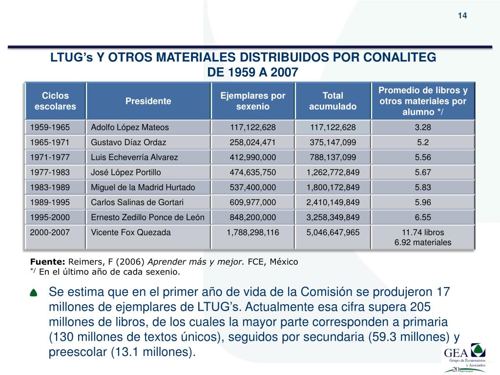 LTUG’s Y OTROS MATERIALES DISTRIBUIDOS POR CONALITEG DE 1959 A 2007 Fuente: Reimers, F (2006) Aprender más y mejor. FCE, México */ En el último año de cada sexenio. Se estima que en el primer año de vida de la Comisión se produjeron 17 millones de ejemplares de LTUG’s. Actualmente esa cifra supera 205 millones de libros, de los cuales la mayor parte corresponden a primaria (130 millones de textos únicos), seguidos por secundaria (59.3 millones) y preescolar (13.1 millones).