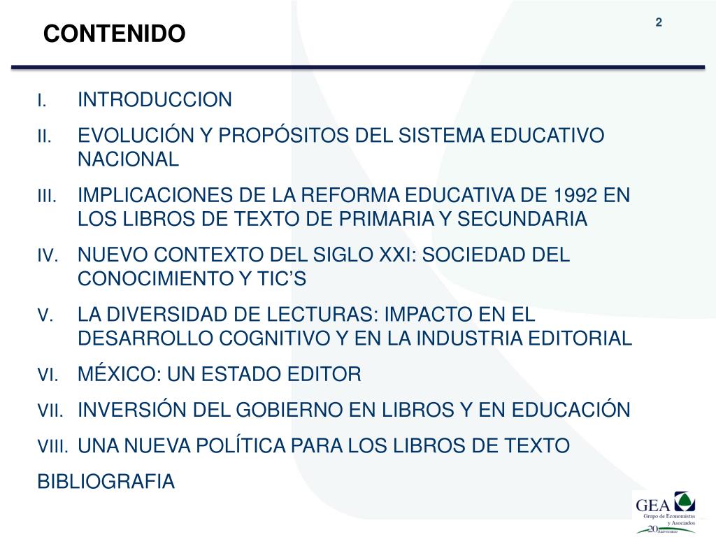 CONTENIDO • INTRODUCCION • EVOLUCIÓN Y PROPÓSITOS DEL SISTEMA EDUCATIVO NACIONAL • IMPLICACIONES DE LA REFORMA EDUCATIVA DE 1992 EN LOS LIBROS DE TEXTO DE PRIMARIA Y SECUNDARIA • NUEVO CONTEXTO DEL SIGLO XXI: SOCIEDAD DEL CONOCIMIENTO Y TIC’S • LA DIVERSIDAD DE LECTURAS: IMPACTO EN EL DESARROLLO COGNITIVO Y EN LA INDUSTRIA EDITORIAL • MÉXICO: UN ESTADO EDITOR • INVERSIÓN DEL GOBIERNO EN LIBROS Y EN EDUCACIÓN • UNA NUEVA POLÍTICA PARA LOS LIBROS DE TEXTO BIBLIOGRAFIA