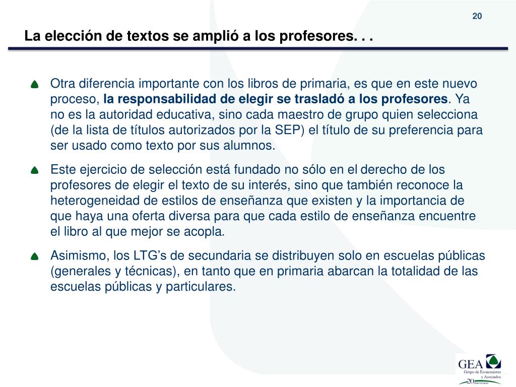 La elección de textos se amplió a los profesores. . . • Otra diferencia importante con los libros de primaria, es que en este nuevo proceso, la responsabilidad de elegir se trasladó a los profesores. Ya no es la autoridad educativa, sino cada maestro de grupo quien selecciona (de la lista de títulos autorizados por la SEP) el título de su preferencia para ser usado como texto por sus alumnos. • Este ejercicio de selección está fundado no sólo en el derecho de los profesores de elegir el texto de su interés, sino que también reconoce la heterogeneidad de estilos de enseñanza que existen y la importancia de que haya una oferta diversa para que cada estilo de enseñanza encuentre el libro al que mejor se acopla. • Asimismo, los LTG’s de secundaria se distribuyen solo en escuelas públicas (generales y técnicas), en tanto que en primaria abarcan la totalidad de las escuelas públicas y particulares.