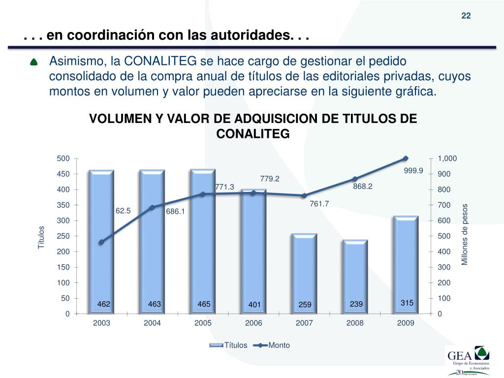 . . . en coordinación con las autoridades. . . • Asimismo, la CONALITEG se hace cargo de gestionar el pedido consolidado de la compra anual de títulos de las editoriales privadas, cuyos montos en volumen y valor pueden apreciarse en la siguiente gráfica. VOLUMEN Y VALOR DE ADQUISICION DE TITULOS DE CONALITEG