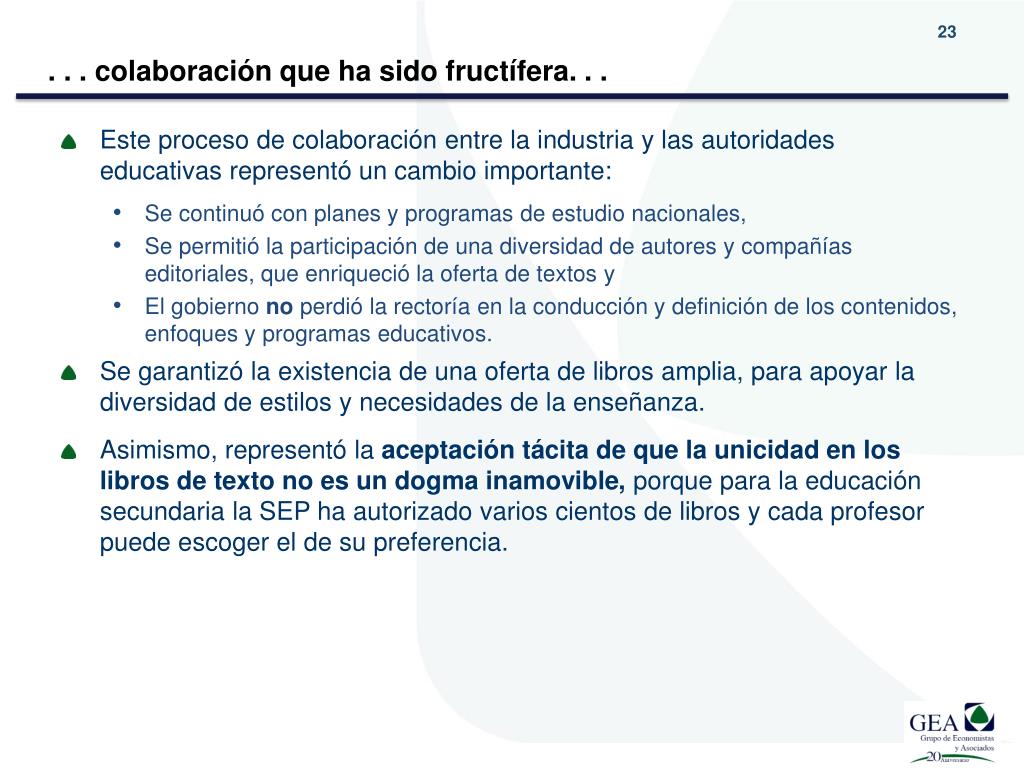 . . . colaboración que ha sido fructífera. . . • Este proceso de colaboración entre la industria y las autoridades educativas representó un cambio importante: • Se continuó con planes y programas de estudio nacionales, • Se permitió la participación de una diversidad de autores y compañías editoriales, que enriqueció la oferta de textos y • El gobierno no perdió la rectoría en la conducción y definición de los contenidos, enfoques y programas educativos. • Se garantizó la existencia de una oferta de libros amplia, para apoyar la diversidad de estilos y necesidades de la enseñanza. • Asimismo, representó la aceptación tácita de que la unicidad en los libros de texto no es un dogma inamovible, porque para la educación secundaria la SEP ha autorizado varios cientos de libros y cada profesor puede escoger el de su preferencia.