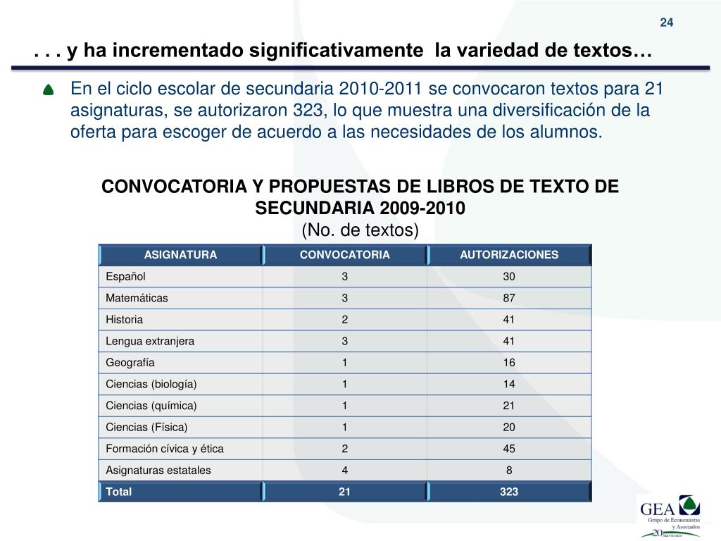 . . . y ha incrementado significativamente la variedad de textos… • En el ciclo escolar de secundaria 2010-2011 se convocaron textos para 21 asignaturas, se autorizaron 323, lo que muestra una diversificación de la oferta para escoger de acuerdo a las necesidades de los alumnos. CONVOCATORIA Y PROPUESTAS DE LIBROS DE TEXTO DE SECUNDARIA 2009-2010 (No. de textos)