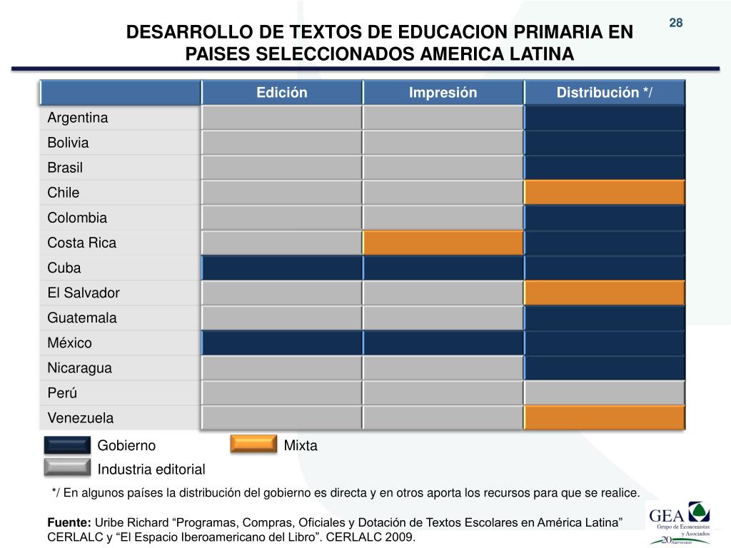 DESARROLLO DE TEXTOS DE EDUCACION PRIMARIA EN PAISES SELECCIONADOS AMERICA LATINA Gobierno Mixta Industria editorial */ En algunos países la distribución del gobierno es directa y en otros aporta los recursos para que se realice. Fuente: Uribe Richard “Programas, Compras, Oficiales y Dotación de Textos Escolares en América Latina” CERLALC y “El Espacio Iberoamericano del Libro”. CERLALC 2009.