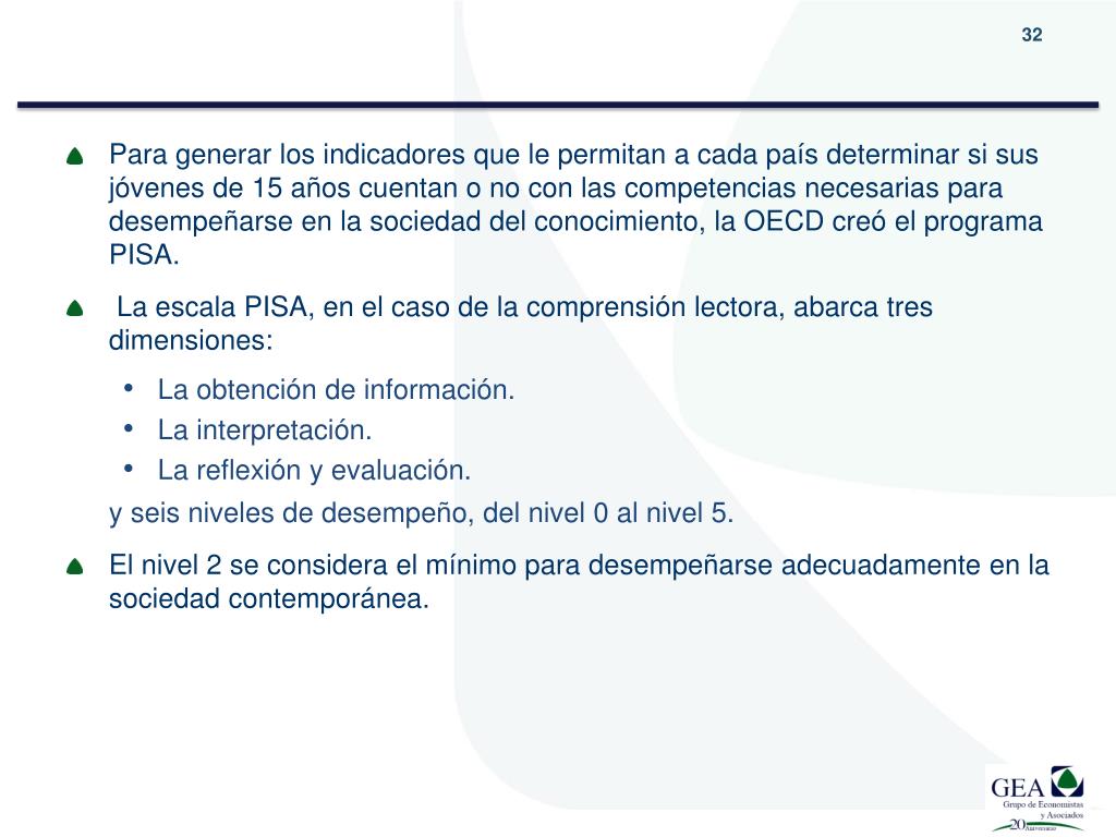 Para generar los indicadores que le permitan a cada país determinar si sus jóvenes de 15 años cuentan o no con las competencias necesarias para desempeñarse en la sociedad del conocimiento, la OECD creó el programa PISA. • La escala PISA, en el caso de la comprensión lectora, abarca tres dimensiones: • La obtención de información. • La interpretación. • La reflexión y evaluación. y seis niveles de desempeño, del nivel 0 al nivel 5. • El nivel 2 se considera el mínimo para desempeñarse adecuadamente en la sociedad contemporánea.