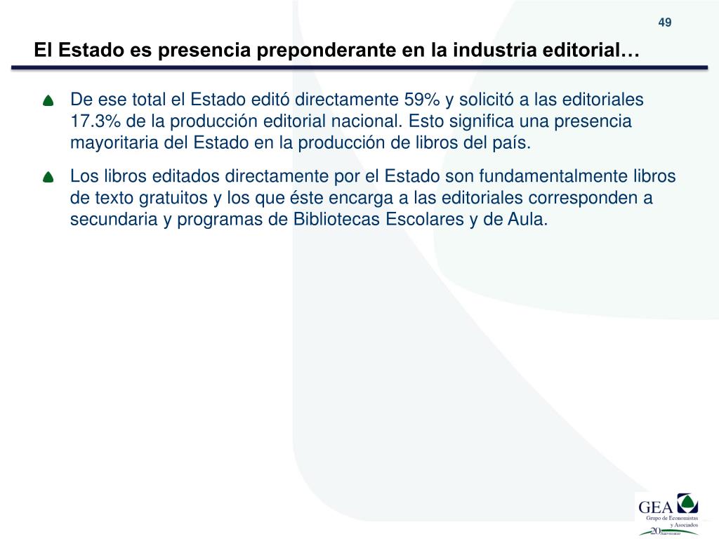 El Estado es presencia preponderante en la industria editorial… • De ese total el Estado editó directamente 59% y solicitó a las editoriales 17.3% de la producción editorial nacional. Esto significa una presencia mayoritaria del Estado en la producción de libros del país. • Los libros editados directamente por el Estado son fundamentalmente libros de texto gratuitos y los que éste encarga a las editoriales corresponden a secundaria y programas de Bibliotecas Escolares y de Aula.