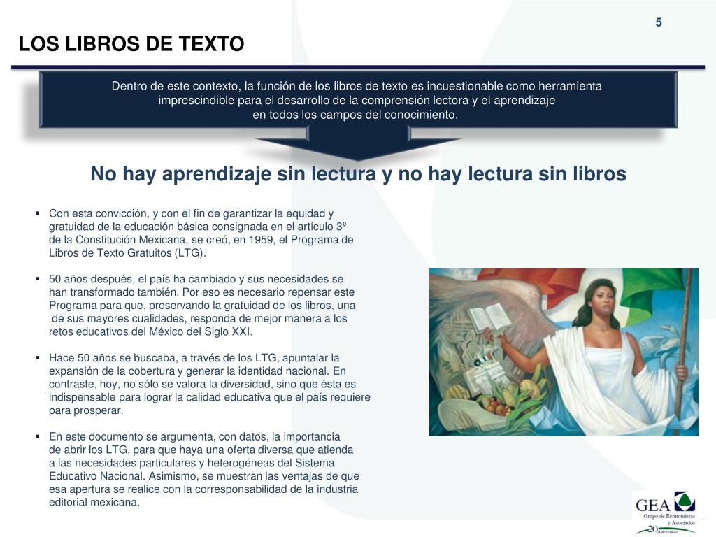LOS LIBROS DE TEXTO Dentro de este contexto, la función de los libros de texto es incuestionable como herramienta imprescindible para el desarrollo de la comprensión lectora y el aprendizaje en todos los campos del conocimiento. No hay aprendizaje sin lectura y no hay lectura sin libros • Con esta convicción, y con el fin de garantizar la equidad y gratuidad de la educación básica consignada en el artículo 3º de la Constitución Mexicana, se creó, en 1959, el Programa de Libros de Texto Gratuitos (LTG). • 50 años después, el país ha cambiado y sus necesidades se han transformado también. Por eso es necesario repensar estePrograma para que, preservando la gratuidad de los libros, una de sus mayores cualidades, responda de mejor manera a los retos educativos del México del Siglo XXI. • Hace 50 años se buscaba, a través de los LTG, apuntalar la expansión de la cobertura y generar la identidad nacional. En contraste, hoy, no sólo se valora la diversidad, sino que ésta es indispensable para lograr la calidad educativa que el país requiere para prosperar. • En este documento se argumenta, con datos, la importancia de abrir los LTG, para que haya una oferta diversa que atienda a las necesidades particulares y heterogéneas del Sistema Educativo Nacional. Asimismo, se muestran las ventajas de queesa apertura se realice con la corresponsabilidad de la industriaeditorial mexicana.