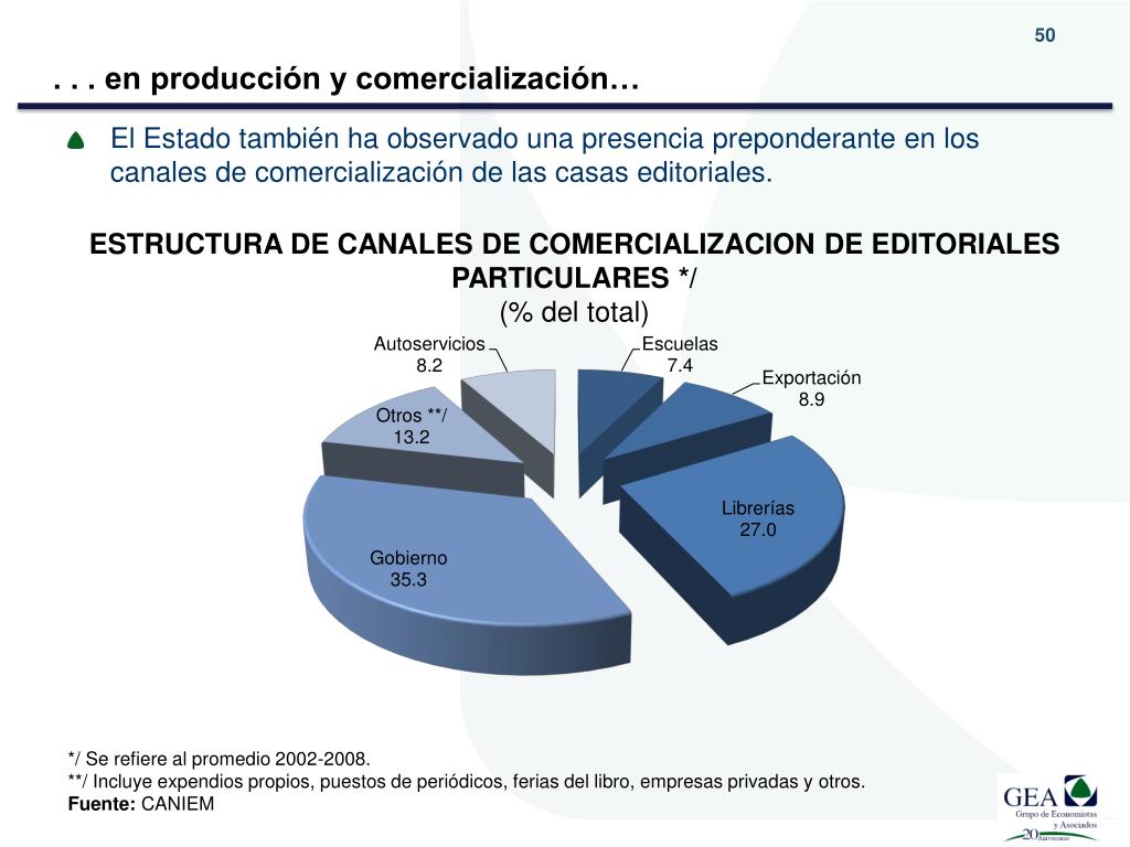 . . . en producción y comercialización… • El Estado también ha observado una presencia preponderante en los canales de comercialización de las casas editoriales. ESTRUCTURA DE CANALES DE COMERCIALIZACION DE EDITORIALES PARTICULARES */ (% del total) */ Se refiere al promedio 2002-2008. **/ Incluye expendios propios, puestos de periódicos, ferias del libro, empresas privadas y otros. Fuente: CANIEM