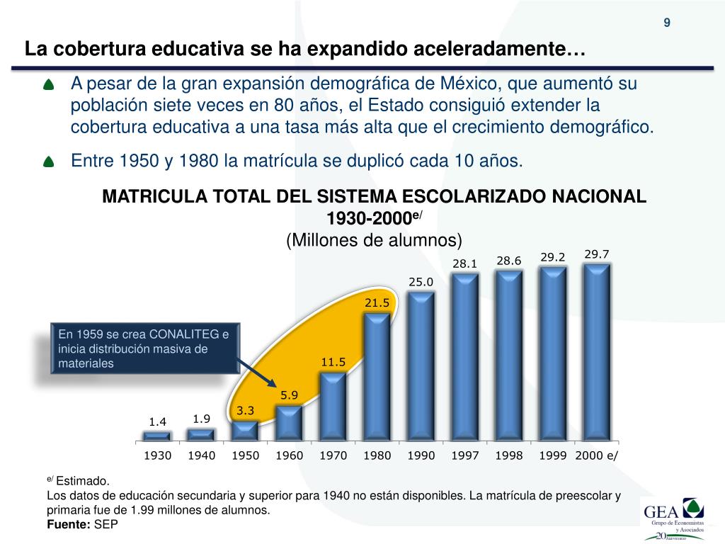 La coberturaeducativa se ha expandidoaceleradamente… • A pesar de la gran expansión demográfica de México, que aumentó su población siete veces en 80 años, el Estado consiguió extender la cobertura educativa a una tasa más alta que el crecimiento demográfico. • Entre 1950 y 1980 la matrícula se duplicó cada 10 años. MATRICULA TOTAL DEL SISTEMA ESCOLARIZADO NACIONAL 1930-2000e/ (Millones de alumnos) En 1959 se crea CONALITEG e inicia distribución masiva de materiales e/ Estimado. Los datos de educación secundaria y superior para 1940 no están disponibles. La matrícula de preescolar y primaria fue de 1.99 millones de alumnos. Fuente: SEP