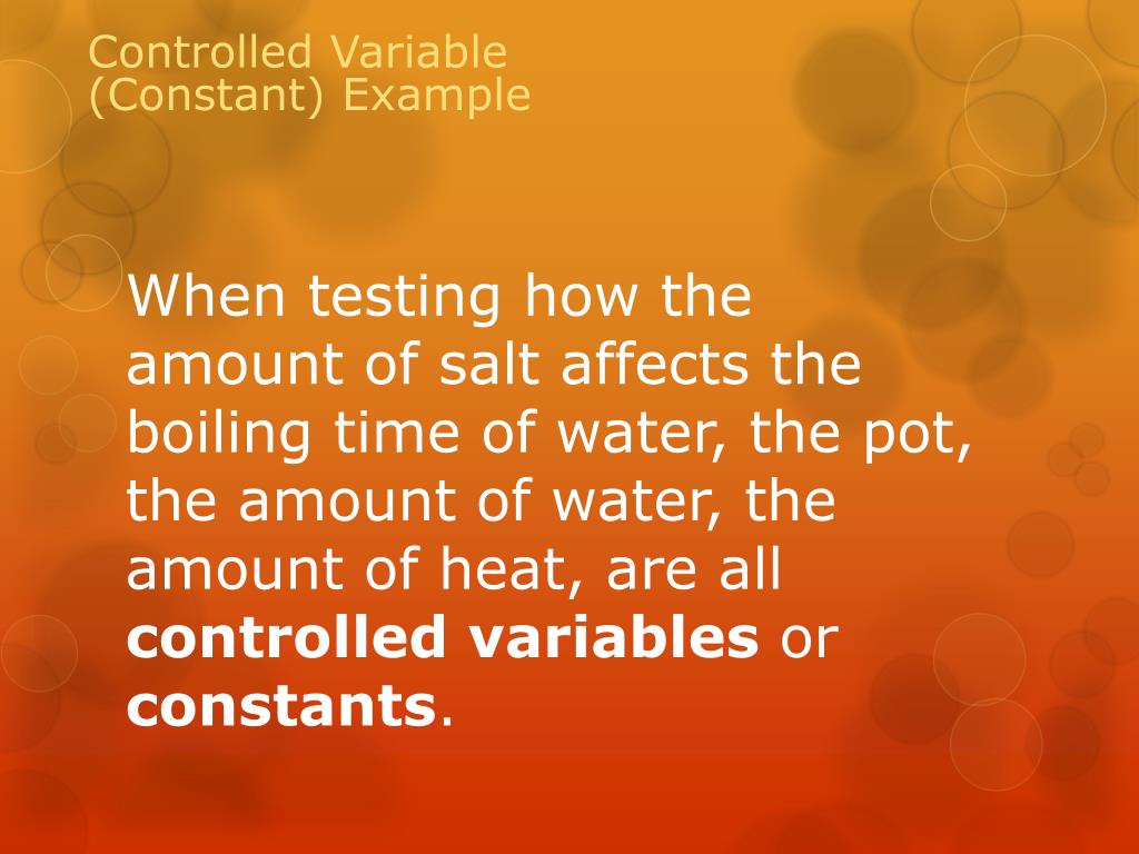 When testing how the amount of salt affects the boiling time of water, the pot, the amount of water, the amount of heat, are all controlledvariables or constants. Controlled Variable(Constant) Example