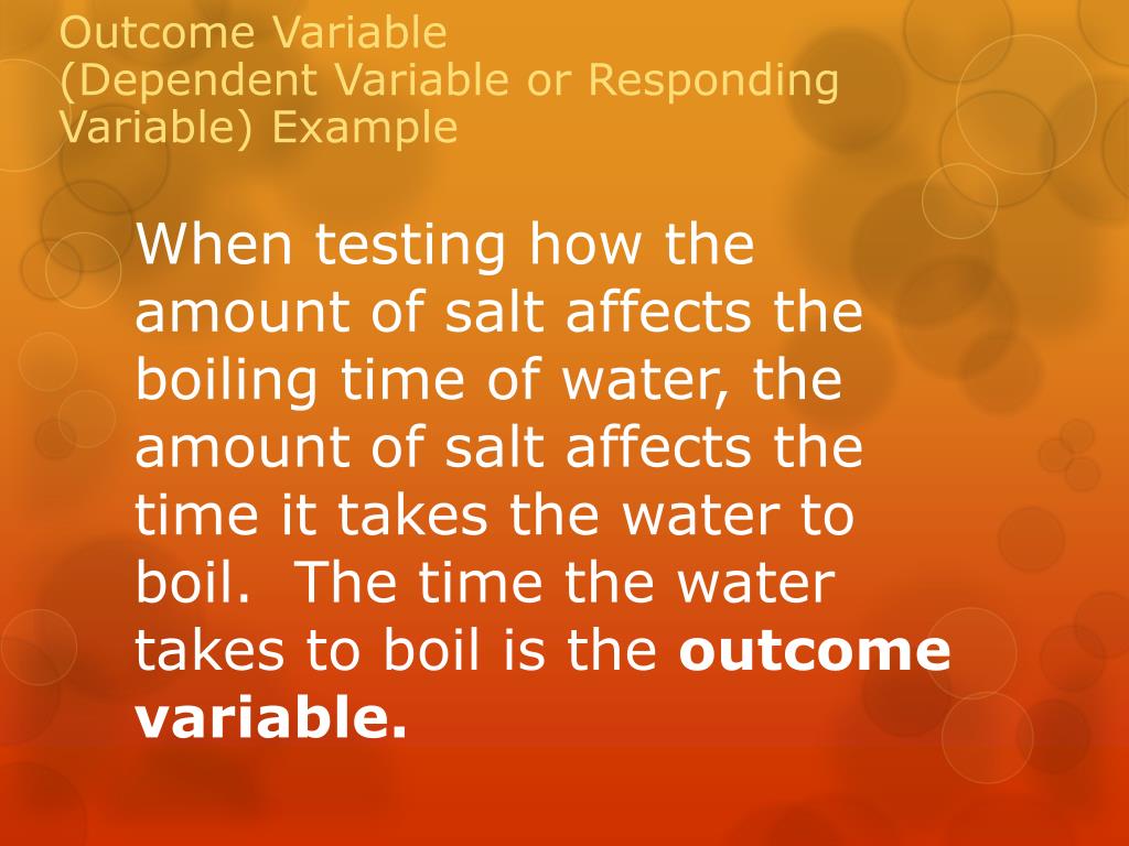 When testing how the amount of salt affects the boiling time of water, the amount of salt affects the time it takes the water to boil. The time the water takes to boil is the outcome variable. Outcome Variable (Dependent Variable or Responding Variable) Example