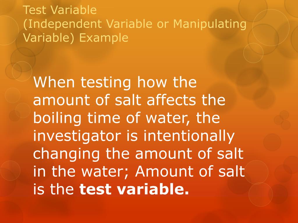 When testing how the amount of salt affects the boiling time of water, the investigator is intentionally changing the amount of salt in the water; Amount of salt is the test variable. Test Variable (Independent Variable or Manipulating Variable) Example