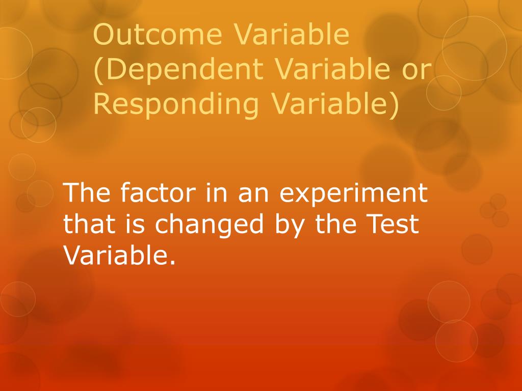 The factor in an experiment that is changed by the Test Variable. Outcome Variable (Dependent Variable or Responding Variable)