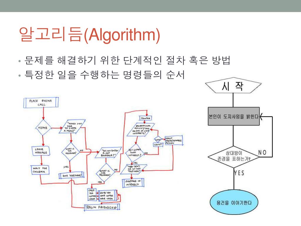 알고리듬(Algorithm) • 문제를 해결하기 위한 단계적인 절차 혹은 방법 • 특정한 일을 수행하는 명령들의 순서