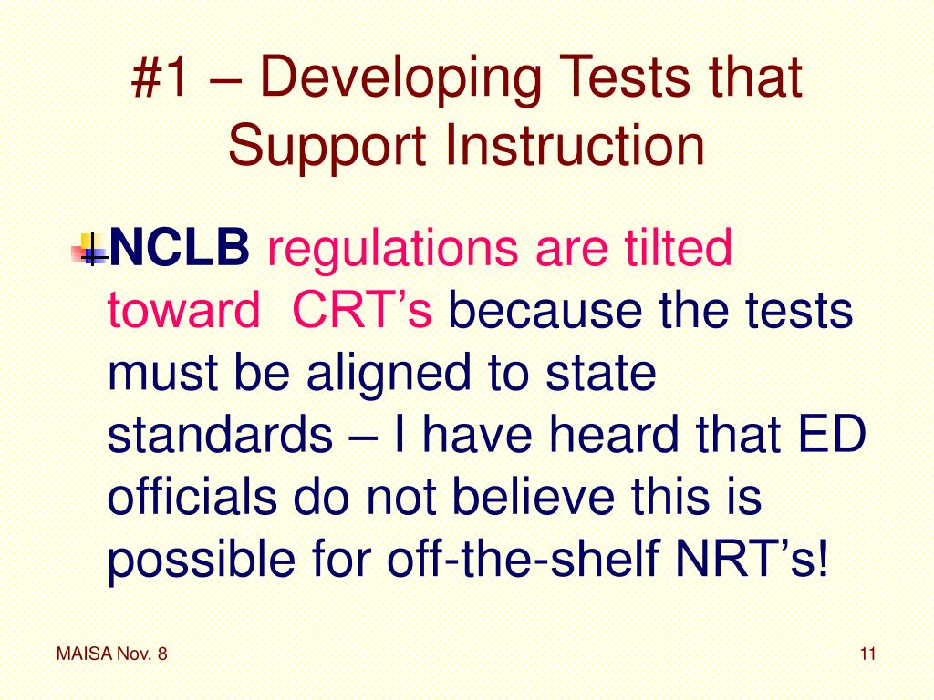#1 – Developing Tests that Support Instruction • NCLBregulations are tilted toward CRT’s because the tests must be aligned to state standards – I have heard that ED officials do not believe this is possible for off-the-shelf NRT’s!