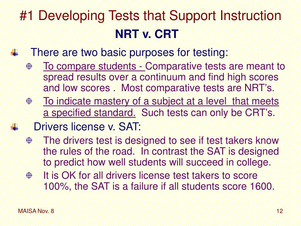 #1 Developing Tests that Support Instruction NRT v. CRT • There are two basic purposes for testing: • To compare students - Comparative tests are meant to spread results over a continuum and find high scores and low scores . Most comparative tests are NRT’s. • To indicate mastery of a subject at a level that meets a specified standard. Such tests can only be CRT’s. • Drivers license v. SAT: • The drivers test is designed to see if test takers know the rules of the road. In contrast the SAT is designed to predict how well students will succeed in college. • It is OK for all drivers license test takers to score 100%, the SAT is a failure if all students score 1600.