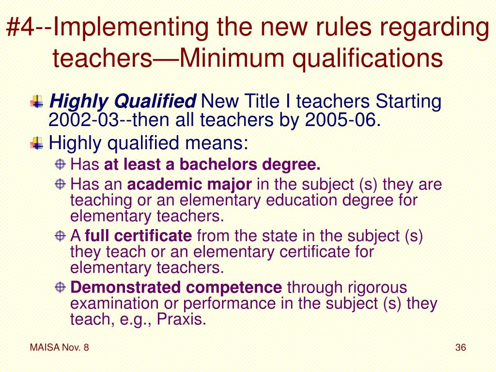 #4--Implementing the new rules regarding teachers—Minimum qualifications • Highly Qualified New Title I teachers Starting 2002-03--then all teachers by 2005-06. • Highly qualified means: • Has at least a bachelors degree. • Has an academic major in the subject (s) they are teaching or an elementary education degree for elementary teachers. • A full certificate from the state in the subject (s) they teach or an elementary certificate for elementary teachers. • Demonstrated competence through rigorous examination or performance in the subject (s) they teach, e.g., Praxis.