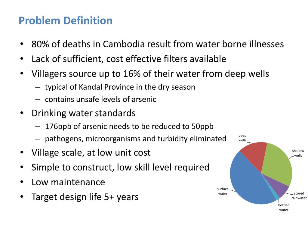 Problem Definition • 80% of deaths in Cambodia result from water borne illnesses • Lack of sufficient, cost effective filters available • Villagers source up to 16% of their water from deep wells • typical of Kandal Province in the dry season • contains unsafe levels of arsenic • Drinking water standards • 176ppb of arsenic needs to be reduced to 50ppb • pathogens, microorganisms and turbidity eliminated • Village scale, at low unit cost • Simple to construct, low skill level required • Low maintenance • Target design life 5+ years