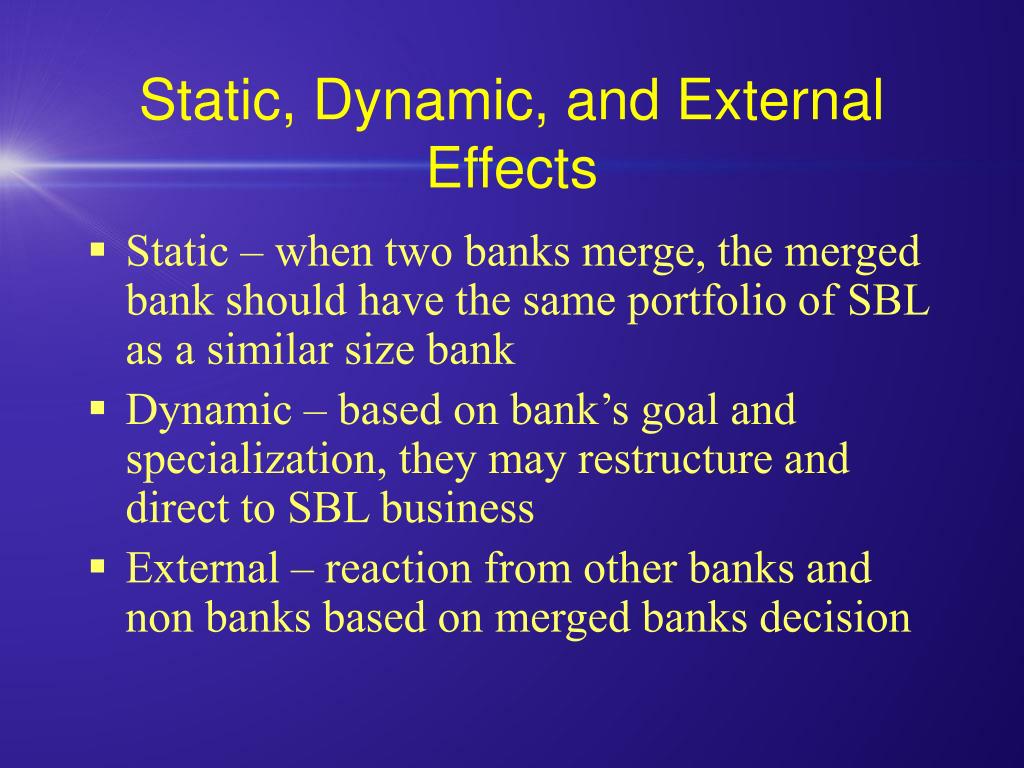Static, Dynamic, and External Effects • Static – when two banks merge, the merged bank should have the same portfolio of SBL as a similar size bank • Dynamic – based on bank’s goal and specialization, they may restructure and direct to SBL business • External – reaction from other banks and non banks based on merged banks decision