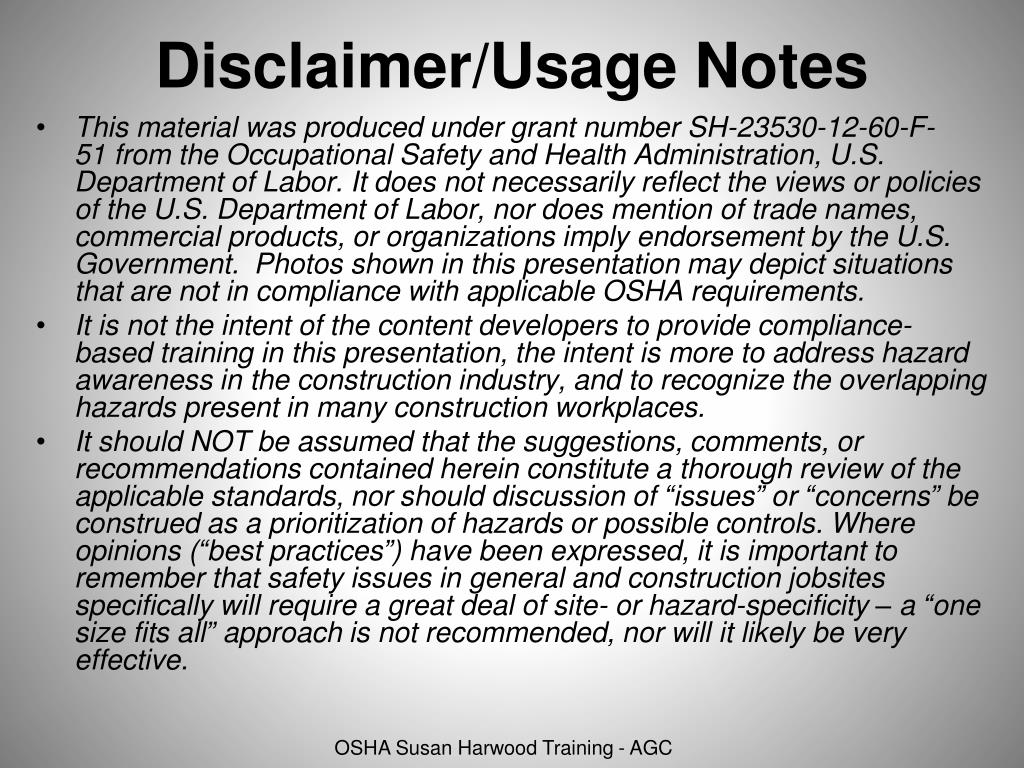 Disclaimer/Usage Notes This material was produced under grant numberSH-23530-12-60-F-51 from the Occupational Safety and Health Administration, U.S. Department of Labor. It does not necessarily reflect the views or policies of the U.S. Department of Labor, nor does mention of trade names, commercial products, or organizations imply endorsement by the U.S. Government. Photos shown in this presentation may depict situations that are not in compliance with applicable OSHA requirements. It is not the intent of the content developers to provide compliance-based training in this presentation, the intent is more to address hazard awareness in the construction industry, and to recognize the overlapping hazards present in many construction workplaces. It should NOT be assumed that the suggestions, comments, or recommendations contained herein constitute a thorough review of the applicable standards, nor should discussion of “issues” or “concerns” be construed as a prioritization of hazards or possible controls. Where opinions (“best practices”) have been expressed, it is important to remember that safety issues in general and construction jobsites specifically will require a great deal of site- or hazard-specificity – a “one size fits all” approach is not recommended, nor will it likely be very effective.