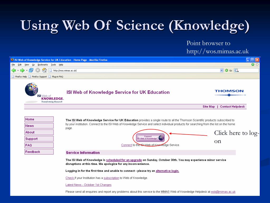 Using Web Of Science (Knowledge) Point browser to http://wos.mimas.ac.uk Click here to log-on