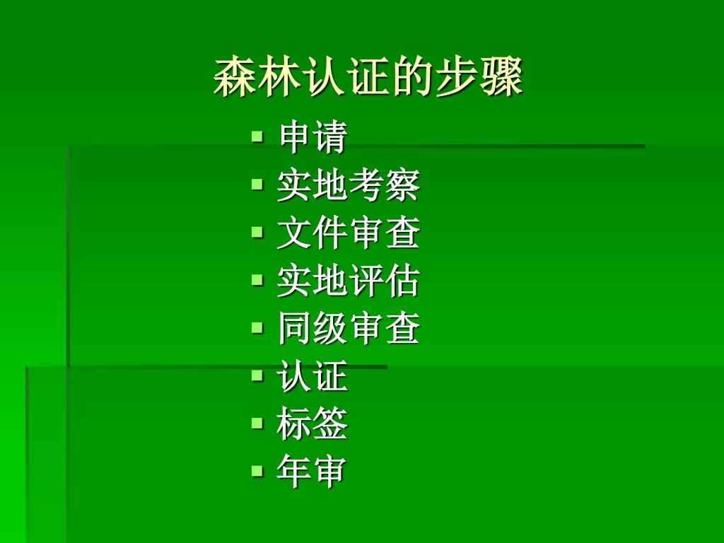 森林认证的步骤 • 申请 • 实地考察 • 文件审查 • 实地评估 • 同级审查 • 认证 • 标签 • 年审