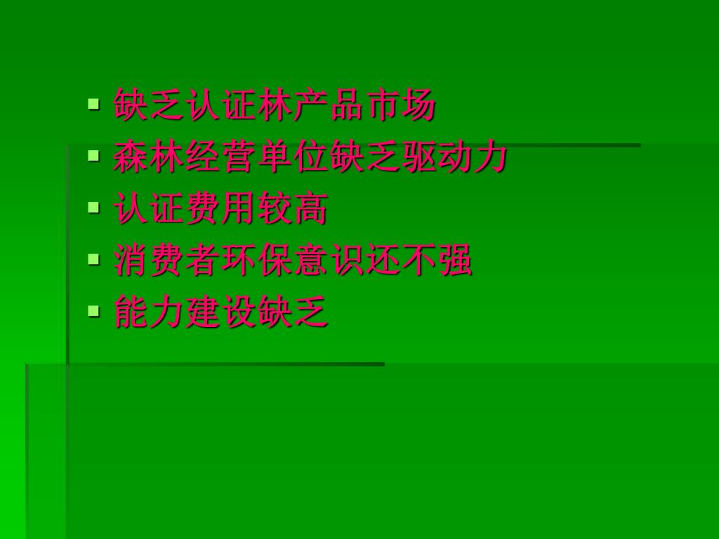 缺乏认证林产品市场 • 森林经营单位缺乏驱动力 • 认证费用较高 • 消费者环保意识还不强 • 能力建设缺乏