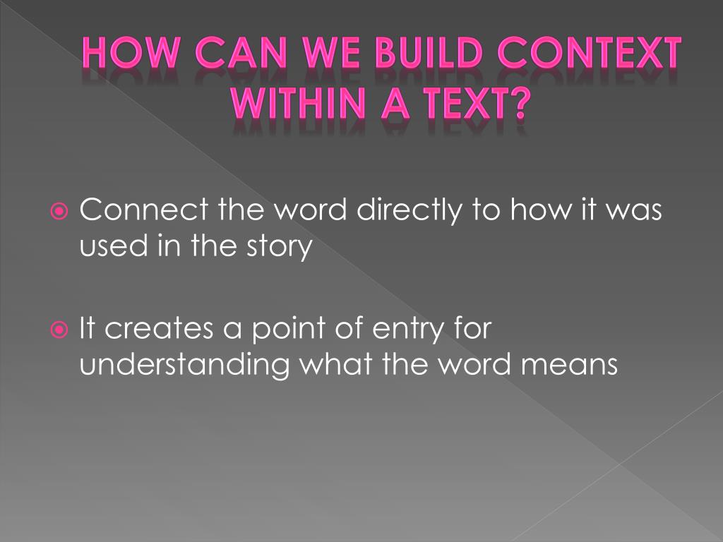 How Can We Build Context Within a Text? • Connect the word directly to how it was used in the story • It creates a point of entry for understanding what the word means