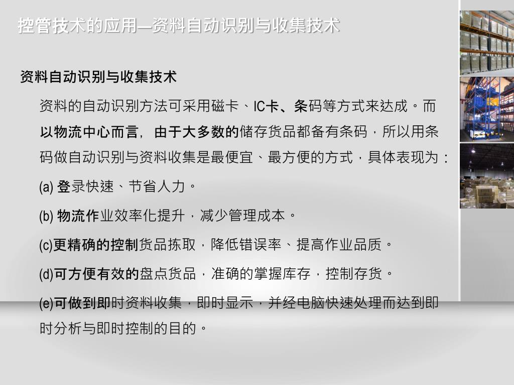控管技术的应用—资料自动识别与收集技术 • 资料自动识别与收集技术 • 资料的自动识别方法可采用磁卡、IC卡、条码等方式来达成。而以物流中心而言,由于大多数的储存货品都备有条码,所以用条码做自动识别与资料收集是最便宜、最方便的方式,具体表现为: • (a) 登录快速、节省人力。 • (b) 物流作业效率化提升,减少管理成本。 • (c)更精确的控制货品拣取,降低错误率、提高作业品质。 • (d)可方便有效的盘点货品,准确的掌握库存,控制存货。 • (e)可做到即时资料收集,即时显示,并经电脑快速处理而达到即时分析与即时控制的目的。