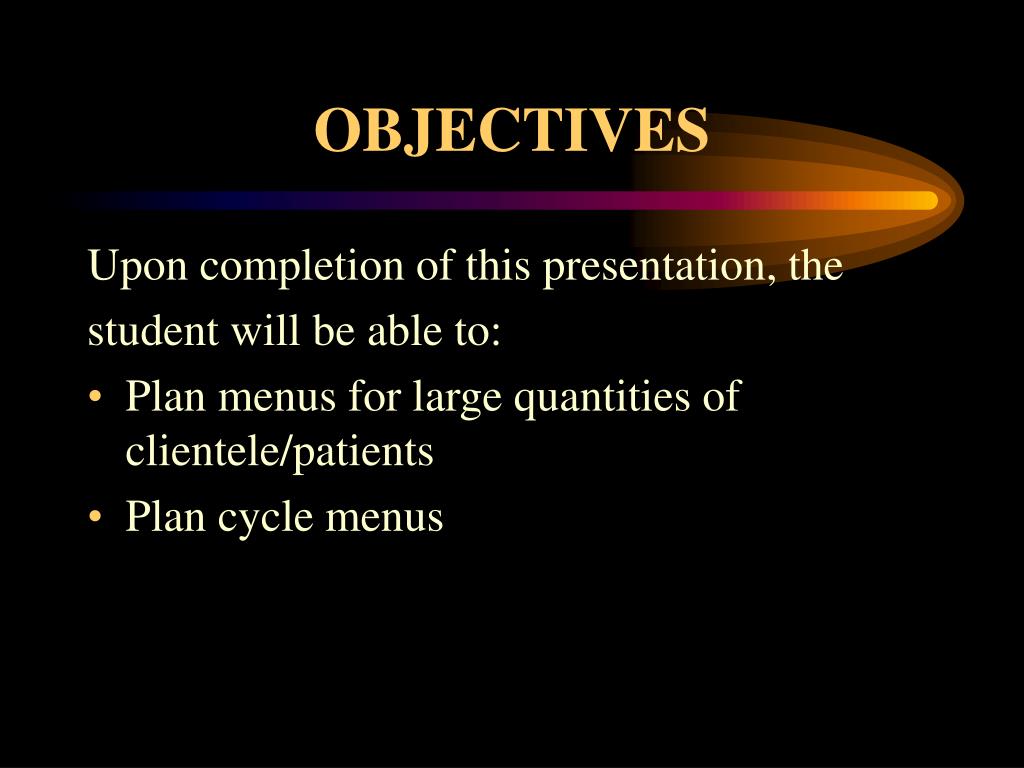 MENU PLANNING. GOALS. To introduce the student to menu planning. OBJECTIVES. Upon completion of this presentation, the student will be able to: Plan menus for large quantities of clientele/patients Plan cycle menus. Menu. A menu is a detailed list of foods to be served