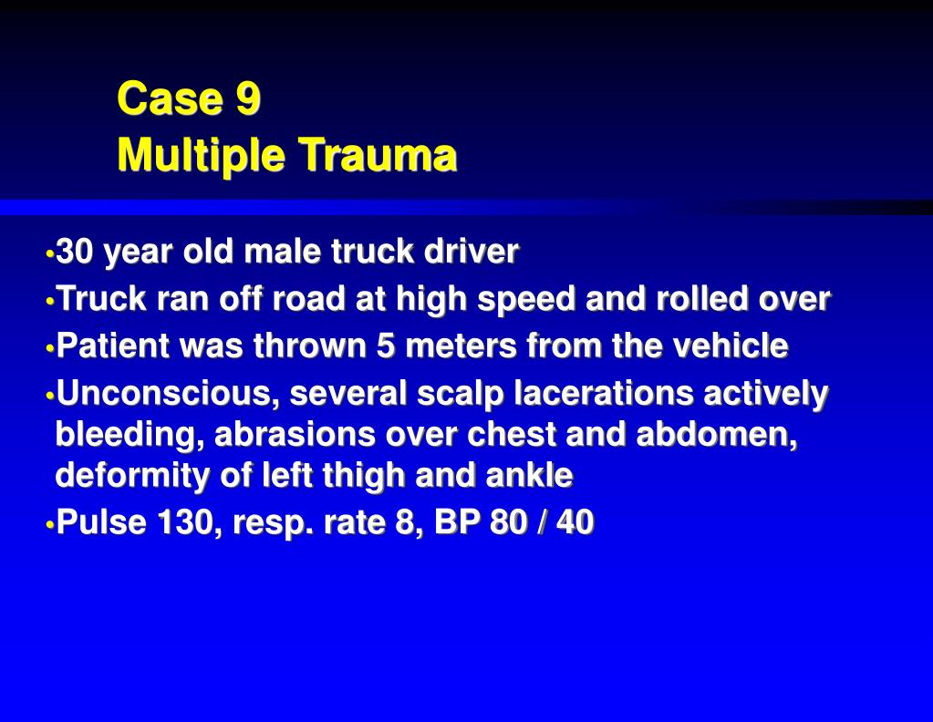 Case 9 Multiple Trauma • 30 year old male truck driver • Truck ran off road at high speed and rolled over • Patient was thrown 5 meters from the vehicle • Unconscious, several scalp lacerations actively bleeding, abrasions over chest and abdomen, deformity of left thigh and ankle • Pulse 130, resp. rate 8, BP 80 / 40