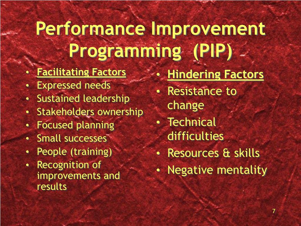 Facilitating Factors Expressed needs Sustained leadership Stakeholders ownership Focused planning Small successes People (training) Recognition of improvements and results Hindering Factors Resistance to change Technical difficulties Resources & skills Negative mentality Performance Improvement Programming (PIP)