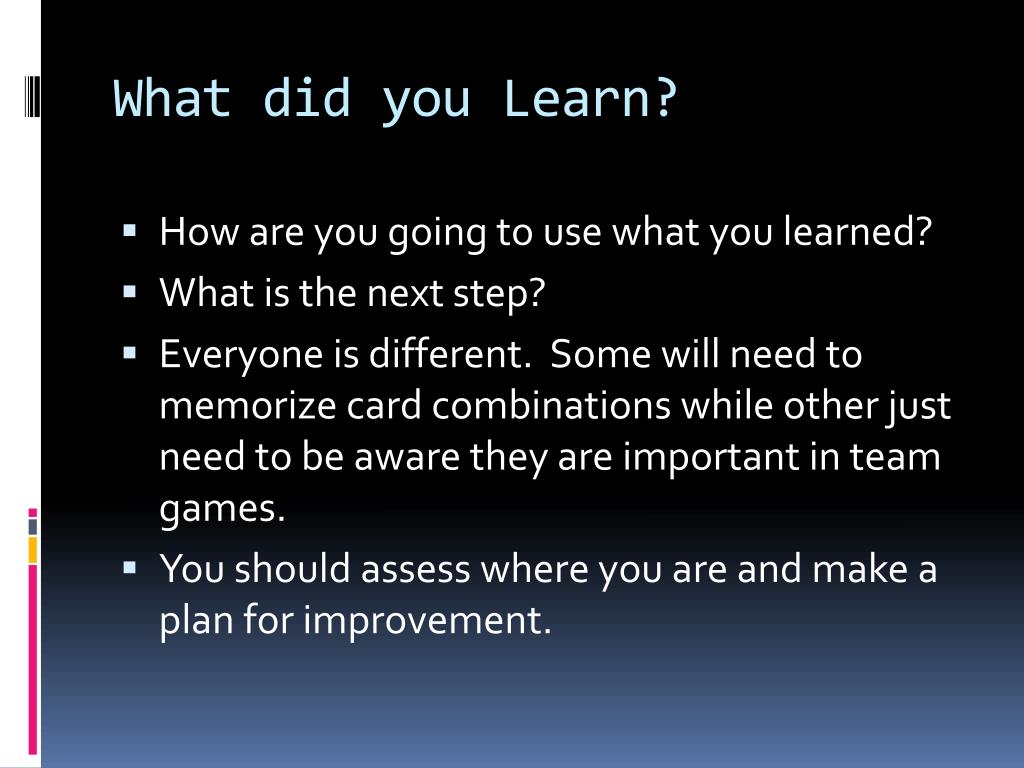 What did you Learn? • How are you going to use what you learned? • What is the next step? • Everyone is different. Some will need to memorize card combinations while other just need to be aware they are important in team games. • You should assess where you are and make a plan for improvement.