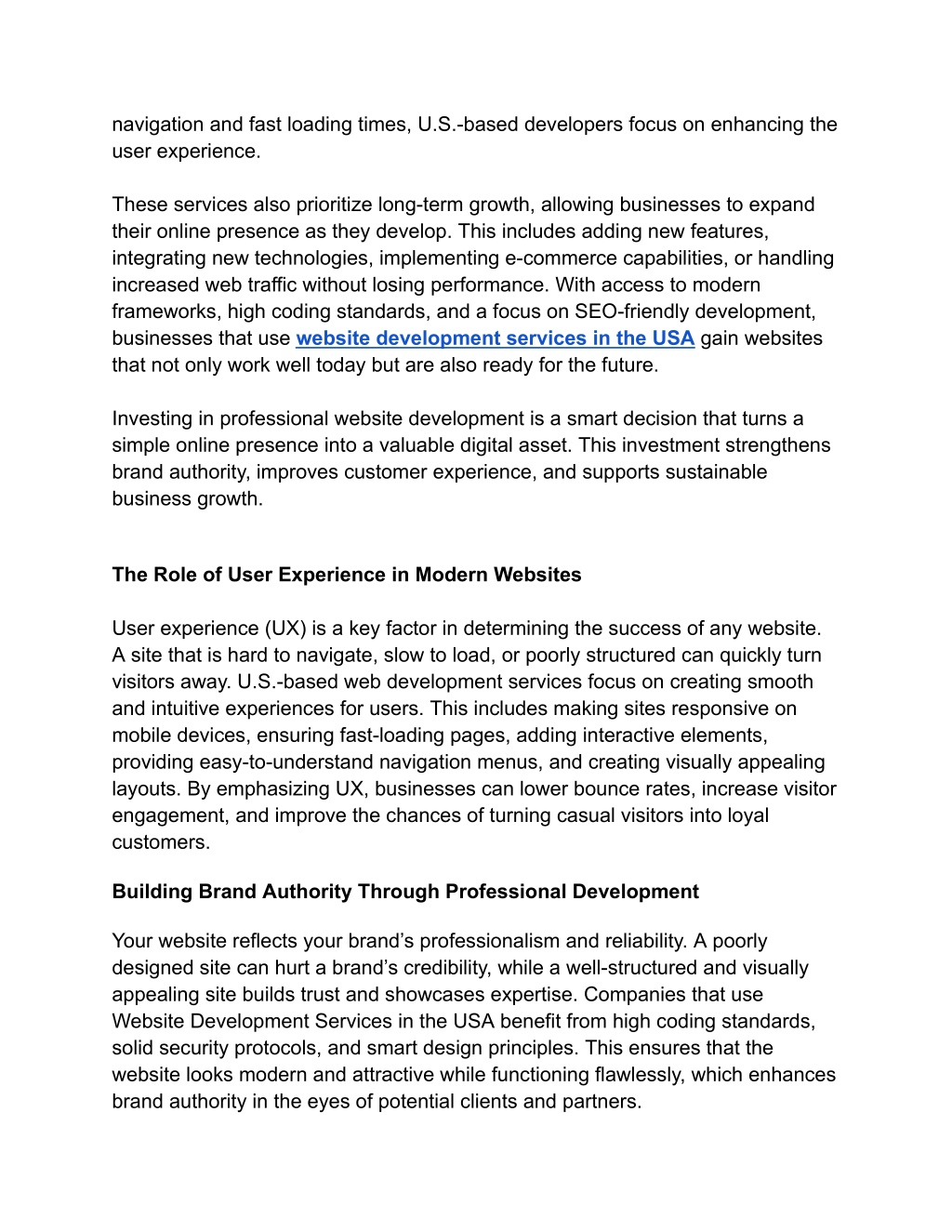 2. navigation and fast loading times, U.S.-based developers focus on enhancing the user experience. These services also prioritize long-term growth, allowing businesses to expand their online presence as they develop. This includes adding new features, integrating new technologies, implementing e-commerce capabilities, or handling increased web traffic without losing performance. With access to modern frameworks, high coding standards, and a focus on SEO-friendly development, businesses that use website development services in the USA gain websites that not only work well today but are also ready for the future. Investing in professional website development is a smart decision that turns a simple online presence into a valuable digital asset. This investment strengthens brand authority, improves customer experience, and supports sustainable business growth. The Role of User Experience in Modern Websites User experience (UX) is a key factor in determining the success of any website. A site that is hard to navigate, slow to load, or poorly structured can quickly turn visitors away. U.S.-based web development services focus on creating smooth and intuitive experiences for users. This includes making sites responsive on mobile devices, ensuring fast-loading pages, adding interactive elements, providing easy-to-understand navigation menus, and creating visually appealing layouts. By emphasizing UX, businesses can lower bounce rates, increase visitor engagement, and improve the chances of turning casual visitors into loyal customers. Building Brand Authority Through Professional Development Your website reflects your brand’s professionalism and reliability. A poorly designed site can hurt a brand’s credibility, while a well-structured and visually appealing site builds trust and showcases expertise. Companies that use Website Development Services in the USA benefit from high coding standards, solid security protocols, and smart design principles. This ensures that the website looks modern and attractive while functioning flawlessly, which enhances brand authority in the eyes of potential clients and partners.