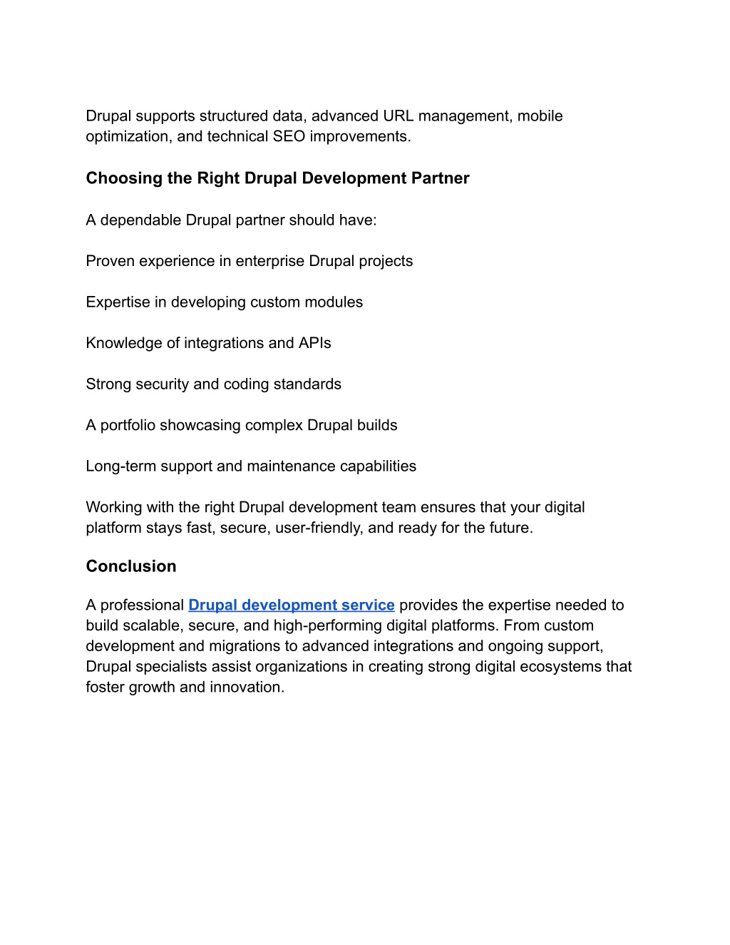 5. Drupal supports structured data, advanced URL management, mobile optimization, and technical SEO improvements. Choosing the Right Drupal Development Partner A dependable Drupal partner should have: Proven experience in enterprise Drupal projects Expertise in developing custom modules Knowledge of integrations and APIs Strong security and coding standards A portfolio showcasing complex Drupal builds Long-term support and maintenance capabilities Working with the right Drupal development team ensures that your digital platform stays fast, secure, user-friendly, and ready for the future. Conclusion A professional Drupal development service provides the expertise needed to build scalable, secure, and high-performing digital platforms. From custom development and migrations to advanced integrations and ongoing support, Drupal specialists assist organizations in creating strong digital ecosystems that foster growth and innovation.
