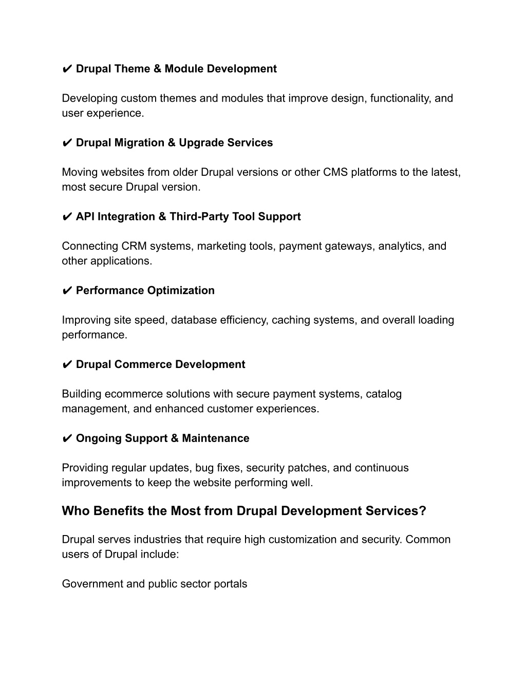 3. ✔ Drupal Theme & Module Development Developing custom themes and modules that improve design, functionality, and user experience. ✔ Drupal Migration & Upgrade Services Moving websites from older Drupal versions or other CMS platforms to the latest, most secure Drupal version. ✔ API Integration & Third-Party Tool Support Connecting CRM systems, marketing tools, payment gateways, analytics, and other applications. ✔ Performance Optimization Improving site speed, database efficiency, caching systems, and overall loading performance. ✔ Drupal Commerce Development Building ecommerce solutions with secure payment systems, catalog management, and enhanced customer experiences. ✔ Ongoing Support & Maintenance Providing regular updates, bug fixes, security patches, and continuous improvements to keep the website performing well. Who Benefits the Most from Drupal Development Services? Drupal serves industries that require high customization and security. Common users of Drupal include: Government and public sector portals
