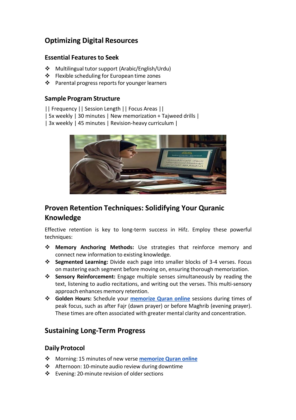 OptimizingDigitalResources • EssentialFeaturestoSeek • Multilingualtutorsupport(Arabic/English/Urdu) • FlexibleschedulingforEuropeantimezones • Parentalprogressreportsforyoungerlearners • SampleProgramStructure • ||Frequency||SessionLength||FocusAreas|| • |5xweekly|30minutes|Newmemorization+Tajweeddrills| • |3xweekly|45minutes|Revision-heavy curriculum| • ProvenRetentionTechniques:SolidifyingYourQuranic Knowledge • Effectiveretentioniskeytolong-termsuccessinHifz.Employthesepowerful techniques: • MemoryAnchoringMethods:Usestrategiesthatreinforcememoryand connectnewinformationtoexistingknowledge. • SegmentedLearning:Divideeachpageintosmallerblocksof3-4verses.Focus onmasteringeachsegmentbeforemovingon,ensuringthoroughmemorization. • SensoryReinforcement:Engagemultiplesensessimultaneouslybyreadingthe text,listeningtoaudio recitations, andwritingouttheverses.Thismulti-sensory approachenhancesmemoryretention. • GoldenHours:ScheduleyourmemorizeQuranonlinesessionsduringtimesof peakfocus,suchas afterFajr(dawnprayer)or beforeMaghrib(eveningprayer). Thesetimesareoftenassociatedwithgreatermentalclarityandconcentration. • SustainingLong-Term Progress • DailyProtocol • Morning:15minutesofnewversememorizeQuranonline • Afternoon:10-minuteaudioreviewduringdowntime • Evening:20-minuterevisionofoldersections