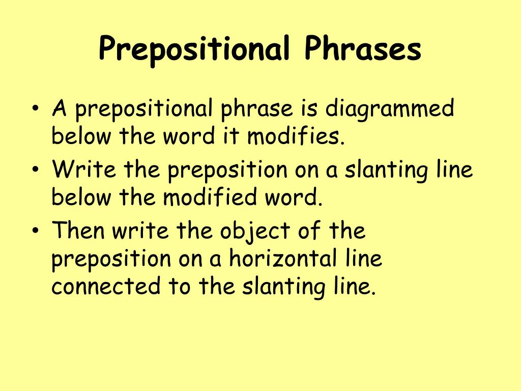 Prepositional Phrases • A prepositional phrase is diagrammed below the word it modifies. • Write the preposition on a slanting line below the modified word. • Then write the object of the preposition on a horizontal line connected to the slanting line.
